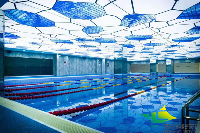 熱烈祝賀我公司徐州游泳館泳池防潮軟膜天花吊頂安裝順利完工并交付客戶使用,此泳池吊頂材料采用我公司高清UV精印防潮天花膜材,內藏防水LED光源,透光效果,亮度高無需再做其他照明設備,整體頂面全部采用我公司專用防潮膜材,安裝效果得到了客戶的滿意,提高了整體裝飾檔次。 實際安裝效果如下圖: